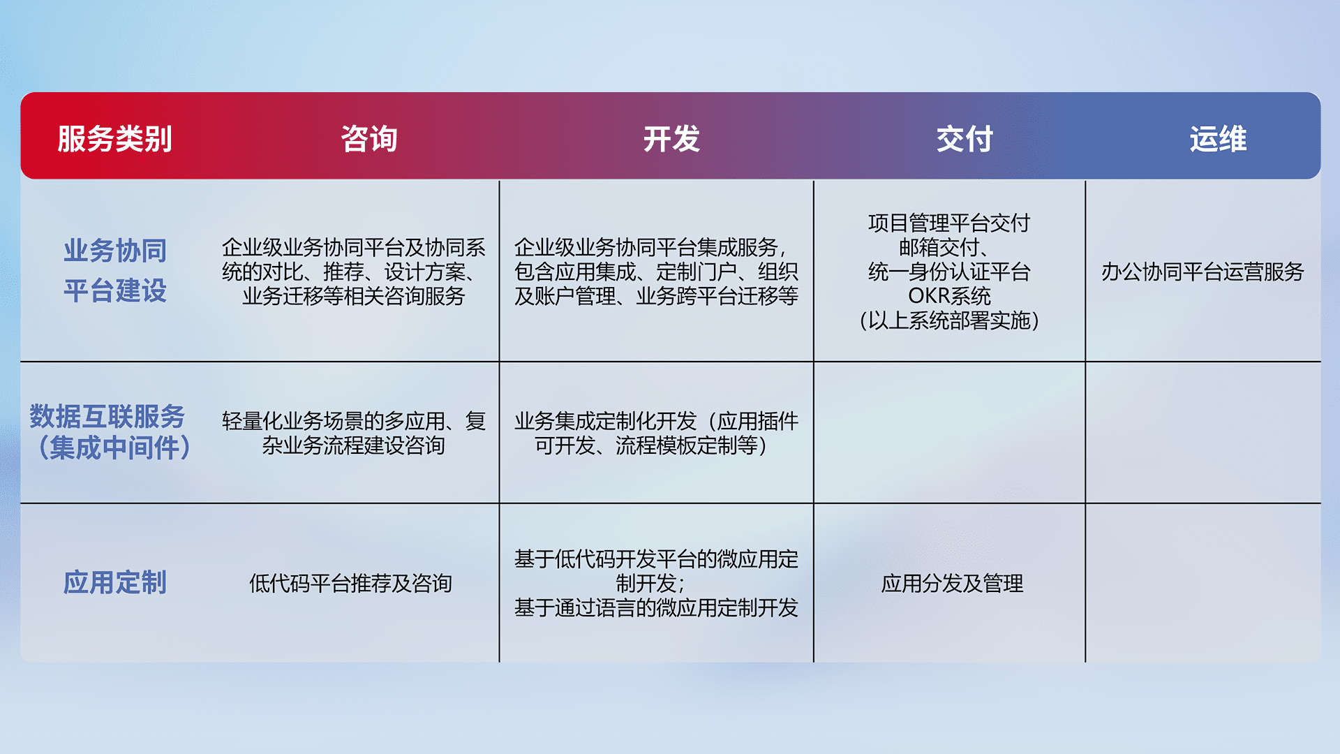 针对钉钉、、、、企微、、IDaas等平台级产品提供产品的规划、、、方案、、交付、、定制化开发等服务,,实现如统一协同办公、、智能客户服务、、混合会议管理、、、、智能数据查询、、、、等业务场景,,,实现数字化转型。。。。