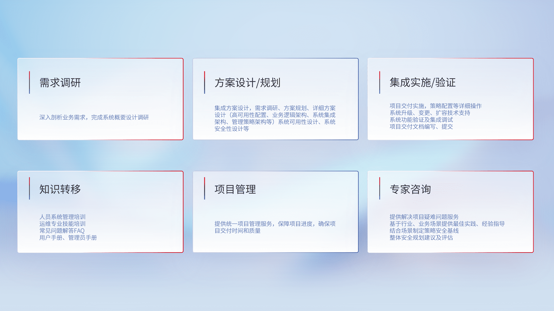 针对客户行业特性,,,将宏观的安全战略和需求,,,,通过专业的交付服务,,,,实现项目落地,,,为客户提供标准规范的集成交付服务。。