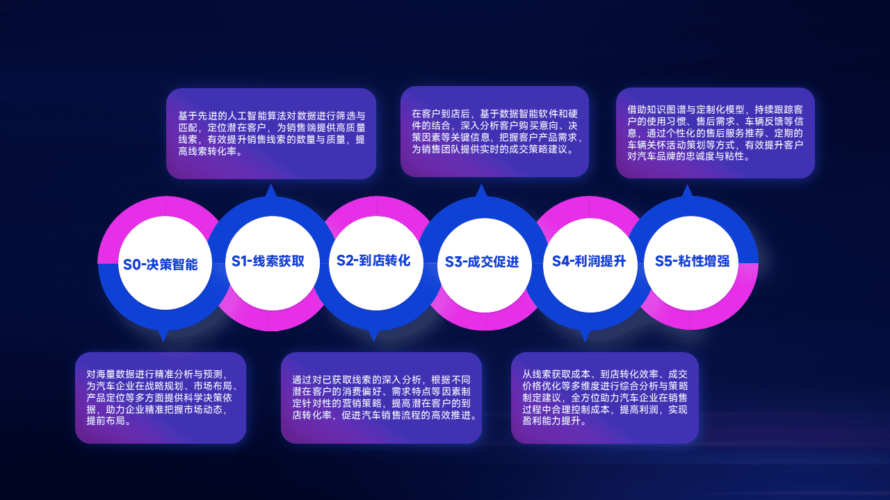 通过拓宽潜在客户来源、、、优化线索分配并提高到店转化率,,,以增强销售效率。。同时,,,,利用线索数据不断优化分析模型,,有效提升转化率,,,,扩大营销影响力。。。
